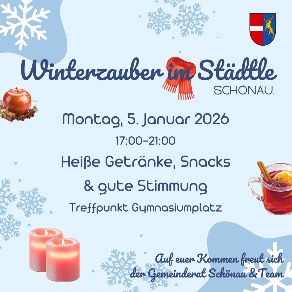 Unter dem Motto „Winterzauber im Städtle“ lädt der gesamte Gemeinderat Schönau & Team alle Bürgerinnen und Bürger sowie Gäste herzlich zu einem stimmungsvollen Abend auf den Gymnasiumsplatz bei den neuen Bänken ein. Die Besucher dürfen sich auf heiße Getränke, Snacks und eine gute Stimmung freuen.