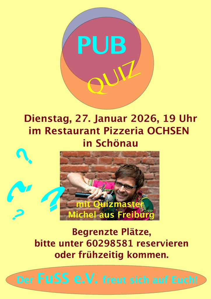 Der Förderverein für umweltfreundliche Stromverteilung und Energieerzeugung Schönau im Schwarzwald e.V. (FuSS e.V.) lädt zum Quiz-Abend ein. Quizmaster Michel aus Freiburg sorgt für kreative, lustige, spannende und originelle Fragen. Es sind alle Altersgruppen herzlich willkommen. Es ist keine Anmeldung erforderlich.