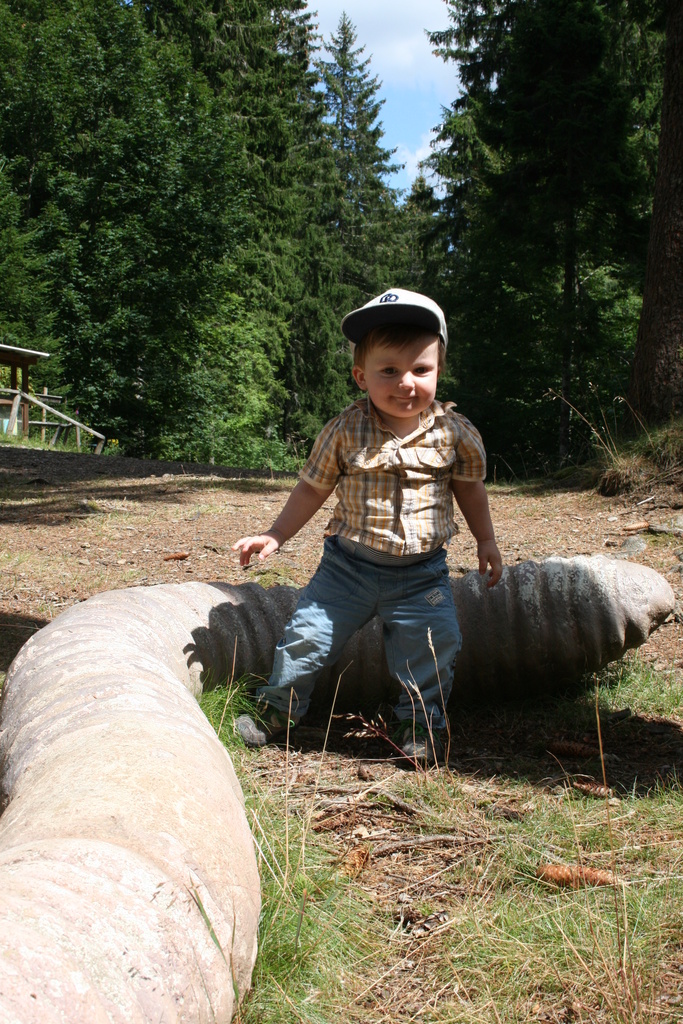 Kind sitzt auf einem nachgebauten, überdimensionalen Riesenregenwurm Orte: Aitern, Wieden